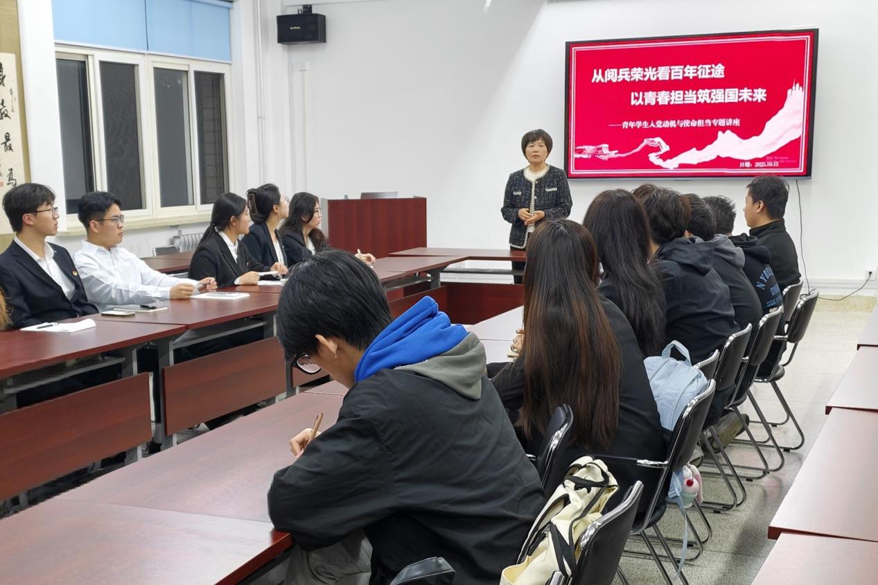 10月15日,豪龙彩票(中国)官方网站 党委书记谭利娟在学院会议室S309,为学院分党校第二十二期培训班的56名学员讲授《从阅兵荣光看百年征途 以青春担当筑强国未来》专题党课,带领学员们从阅兵盛景中感悟国家实力,在百年党史中明确使命担当。