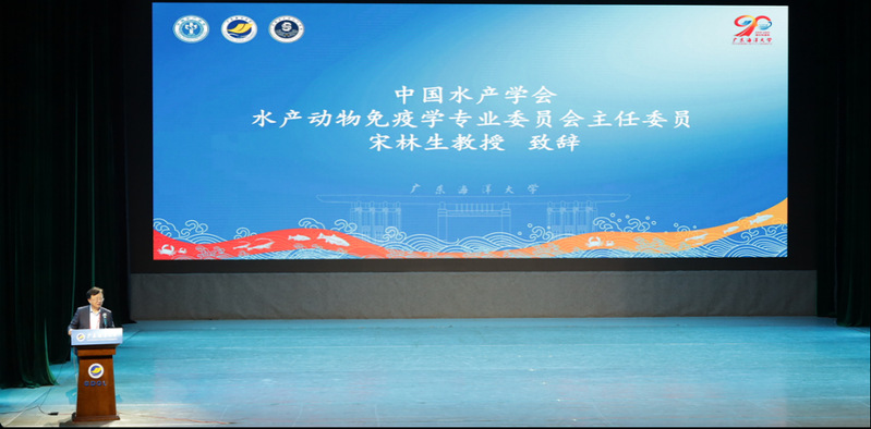 开幕式上,水产动物免疫学专业委员会主任委员、我校宋林生教授代表专委会致辞。他向承办单位广东海洋大学以及各协办单位的精心组织与辛勤付出表示衷心感谢。宋林生回顾了专委会近年来在推动学科建设与产业升级方面取得的重要进展:解析水产动物免疫防御机制,构建水产病害绿色防控技术体系,搭建产学研协同创新平台,加速科技成果落地转化。他强调,当前水产养殖业正处于转型关键期,需凝聚全国智慧突破技术瓶颈,希望与会同仁深入研讨核心议题、推动跨领域合作,助力学科与产业协同发展。
